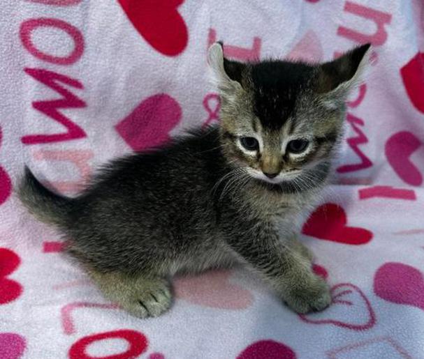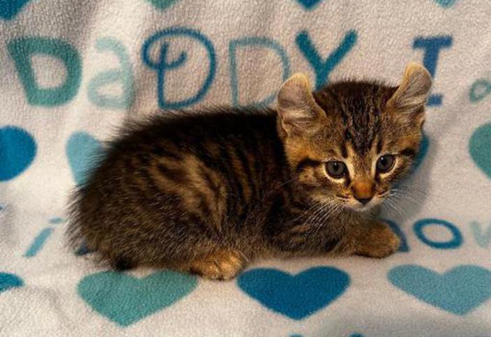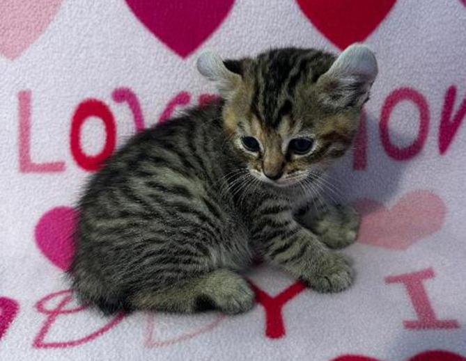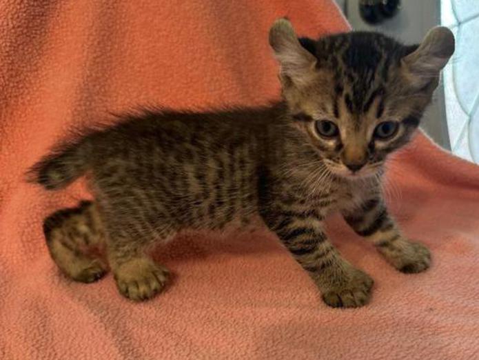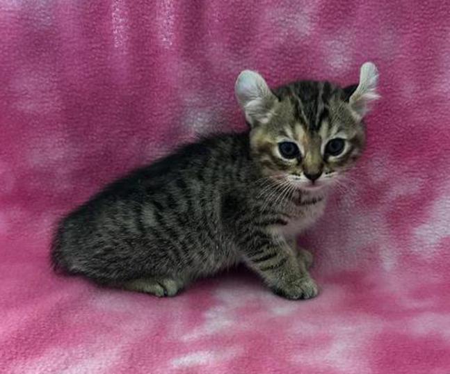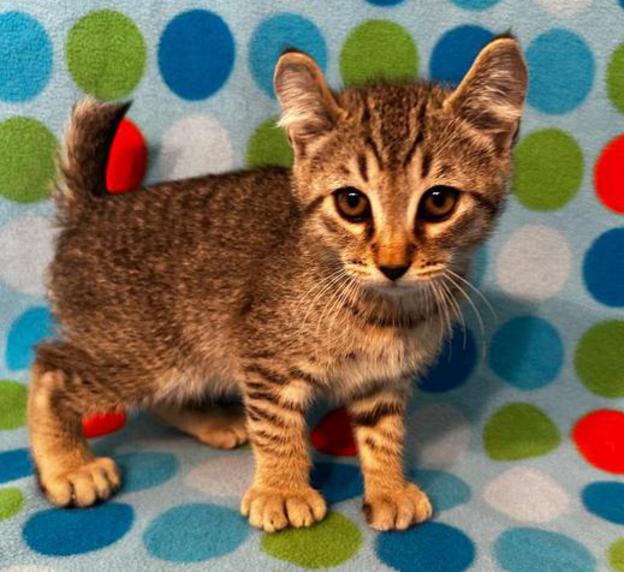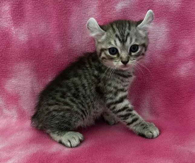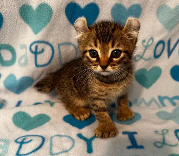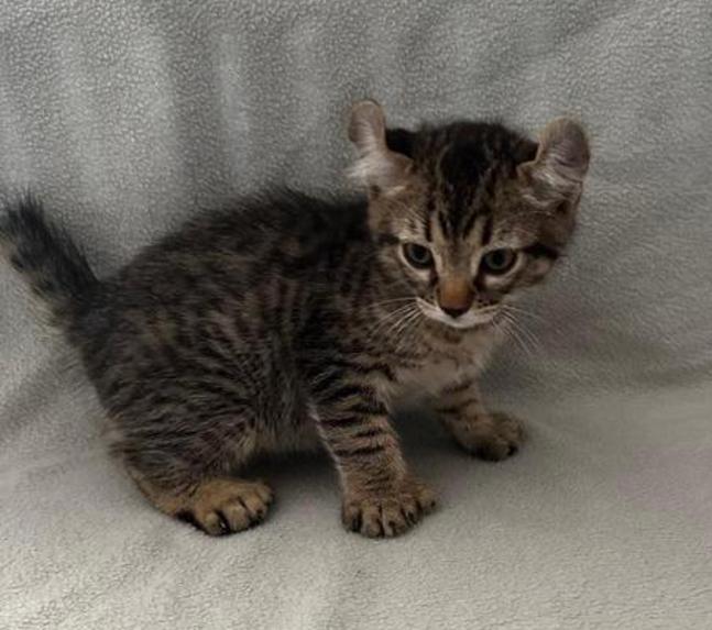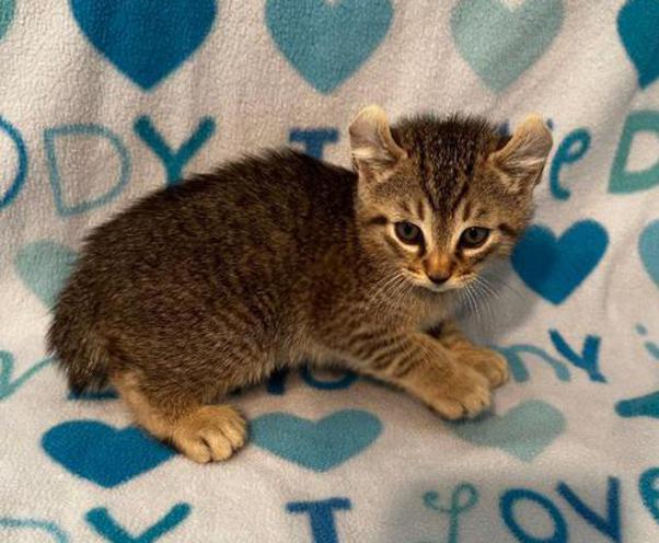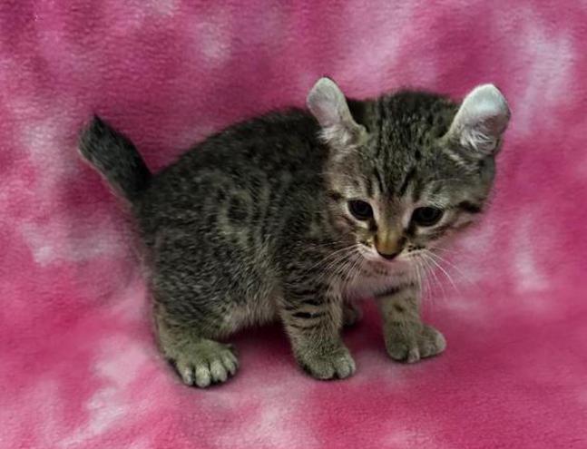 5g....Brown Spotted Tabby Female w/curled ears, 4 polydactyl feet & shortened tail. I am available