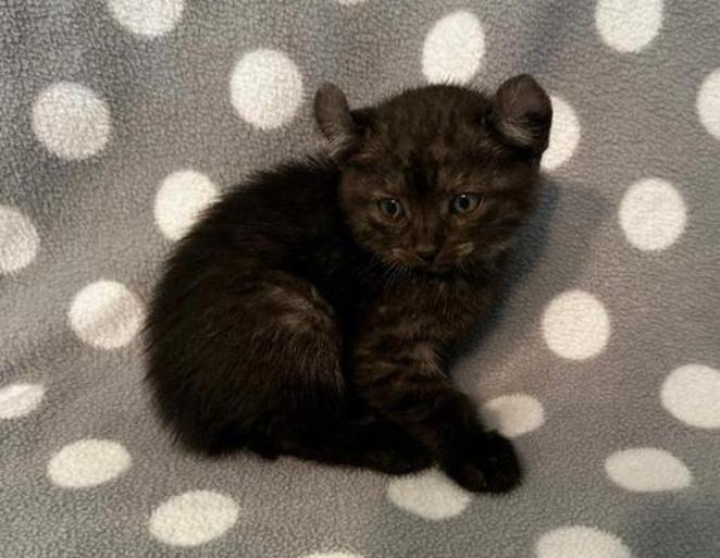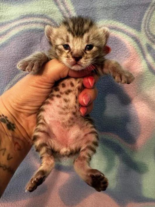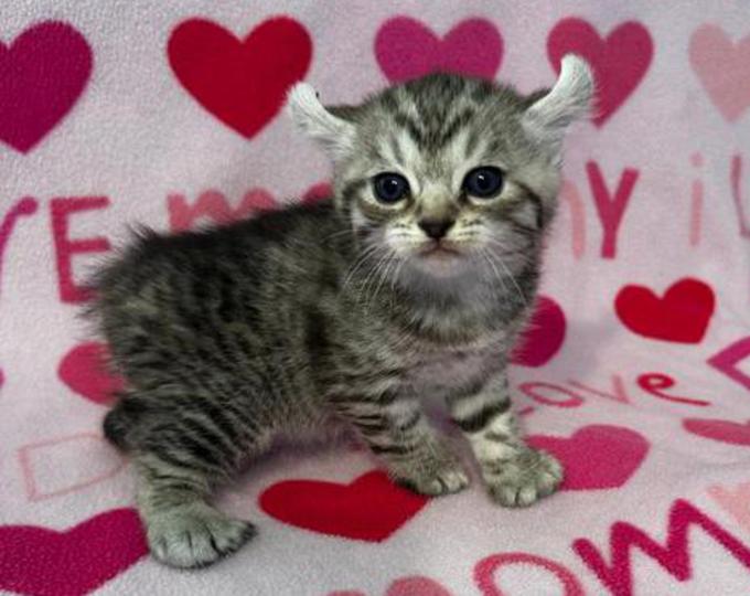2g....Silver/Black Spotted Tabby Female w/curled ears, 4 polydactyl feet & no tail. I am available