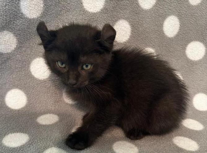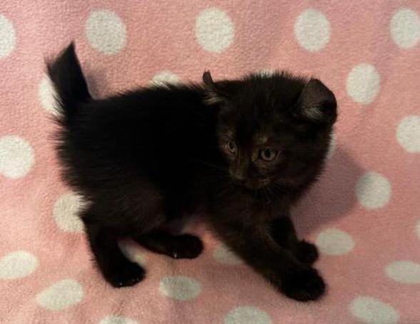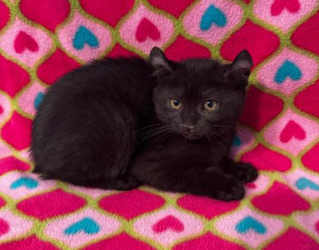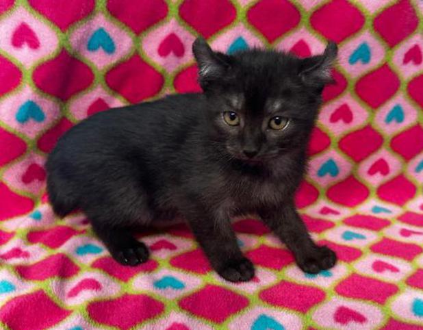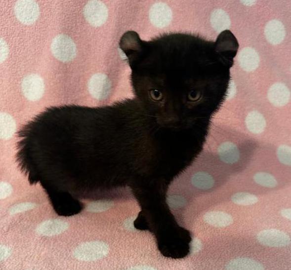 2d....Solid Black Female w/curled ears, 2 polydactyl feet & shortened tail. I am available