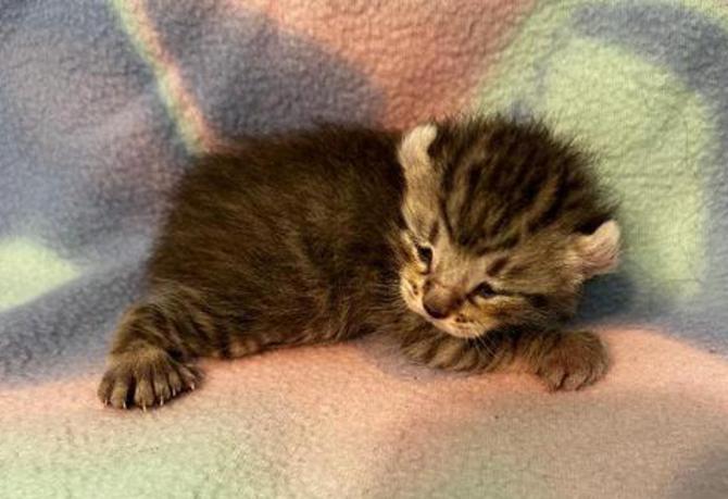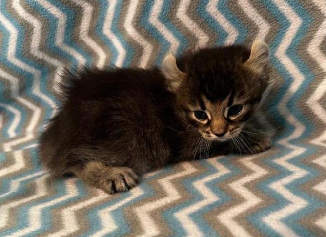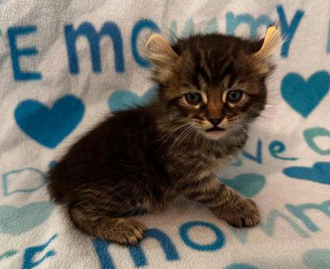 3p....Brown ticked tabby female w/curled ears, 4 polydactyl feet & natural short tail. I am available
