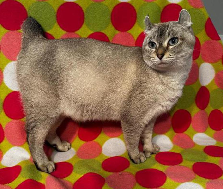 She is a seal lynx point female w/curled ears, polydactyl feet & no tail.